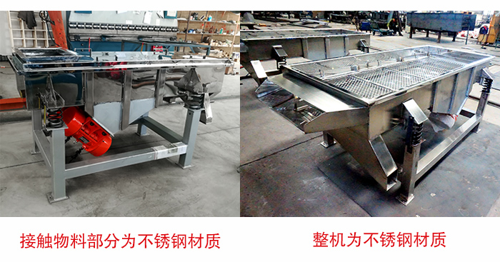 直線振動篩有兩種選擇方式:①接觸物料部分為不銹鋼材質,其他部分為碳鋼材質,②整機為不銹鋼材質,具體選擇哪種不銹鋼直線振動篩,還需要根據物料性質以及用戶的實際需求選用不同的材質,如果您的適用場景對衛生要求高的話可以采用第二種方案。