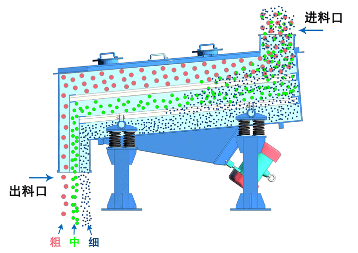 電機通過三角帶使激振器的偏心塊高速旋轉,運行的偏心塊產生很大的離心力,刺激篩箱產生一定幅度的圓周運動,篩上的物料在傾斜的篩面上受到篩箱傳遞的沖量,產生連續的拋擲運動,物料與篩面相遇的過程使小于篩孔的顆粒通過篩網,從而實現分級。